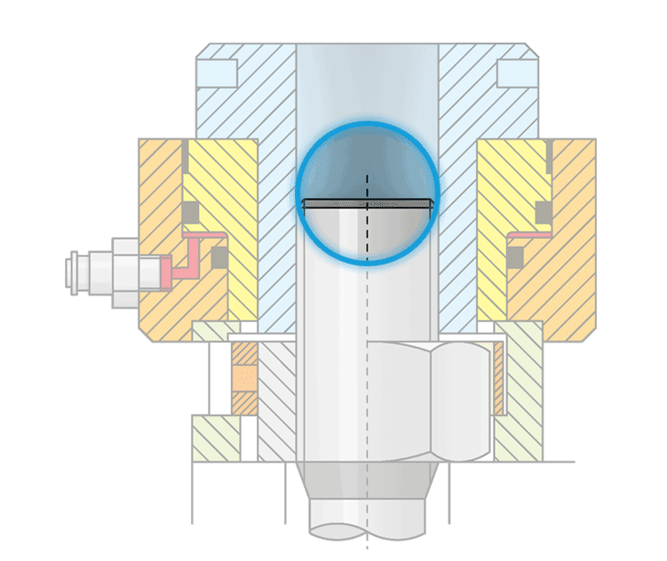 Place the SSV onto the bolt to be tensioned and screw the Thread Sleeve down to the Piston surface. A hydraulic high-pressure pump, through a flexible hose, feeds oil into the space between Cylinder and Piston. The hydraulic pressure increases.